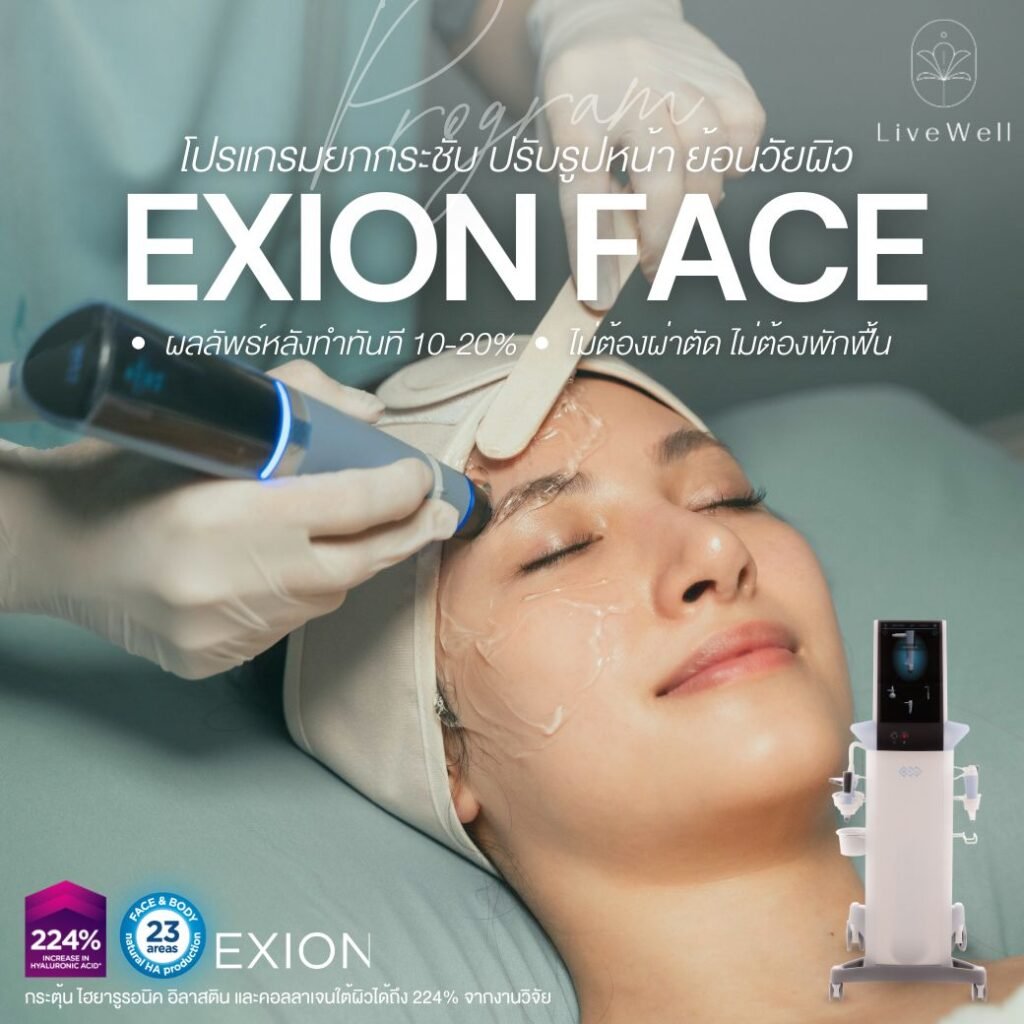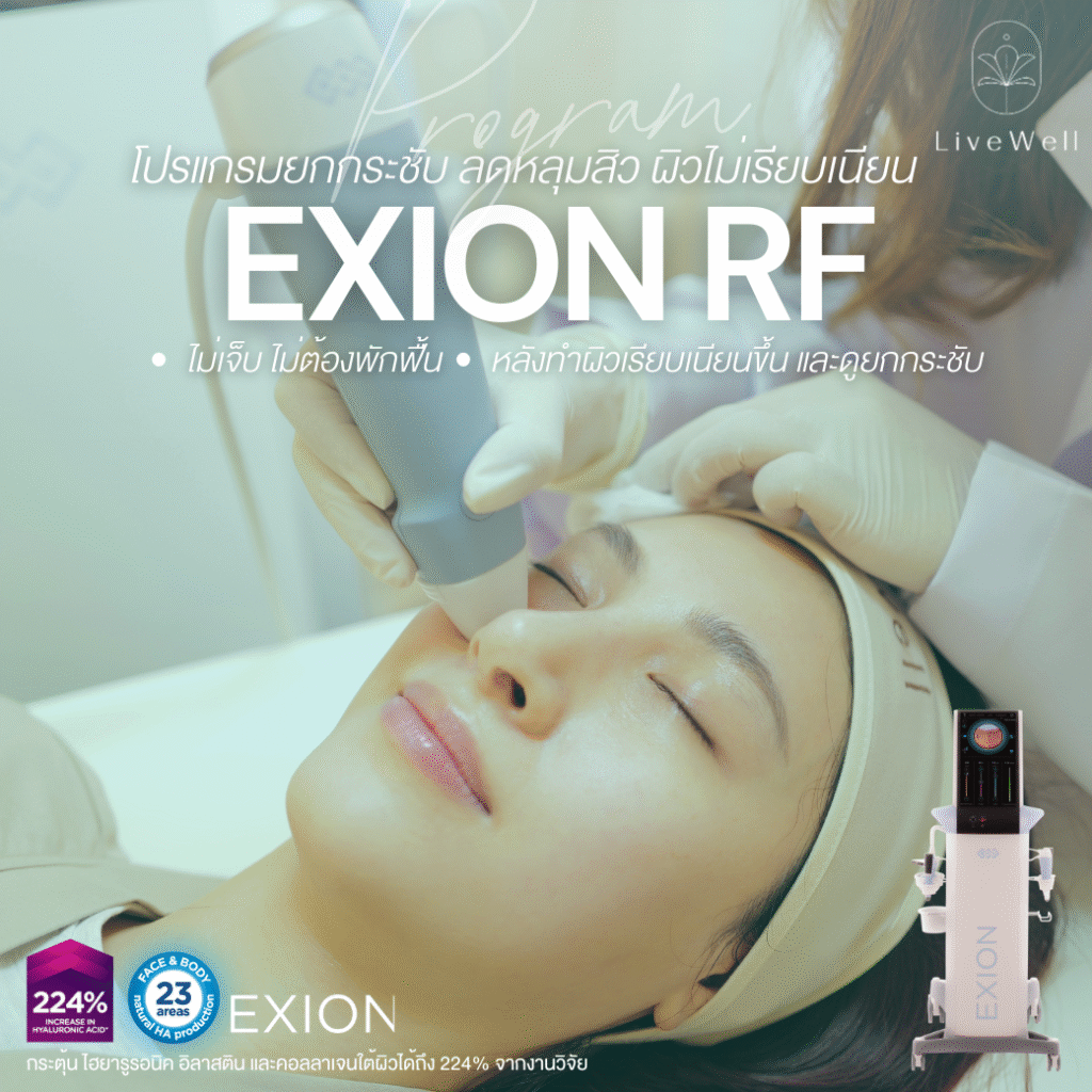 Exion Program นวัตกรรมใหม่ล่าสุด ช่วยยกกระชับ พร้อมกระตุ้นการผลิต HA Elastin Collagen ใต้ผิวอย่างเป็นธรรมชาติ ดูแลครบทั้งเรือนร่างตั้งแต่ผิวพรรณ รวมไปถึงภายในเทคโนโลยีล่าสุดที่ได้รับการรับรอง FDA จากสหรัฐอเมริกา ผสานพลัง AI Monopolar RF & Targeted Ultrasound เพื่อฟื้นคืนความอ่อนเยาว์อย่างล้ำลึกและปลอดภัย